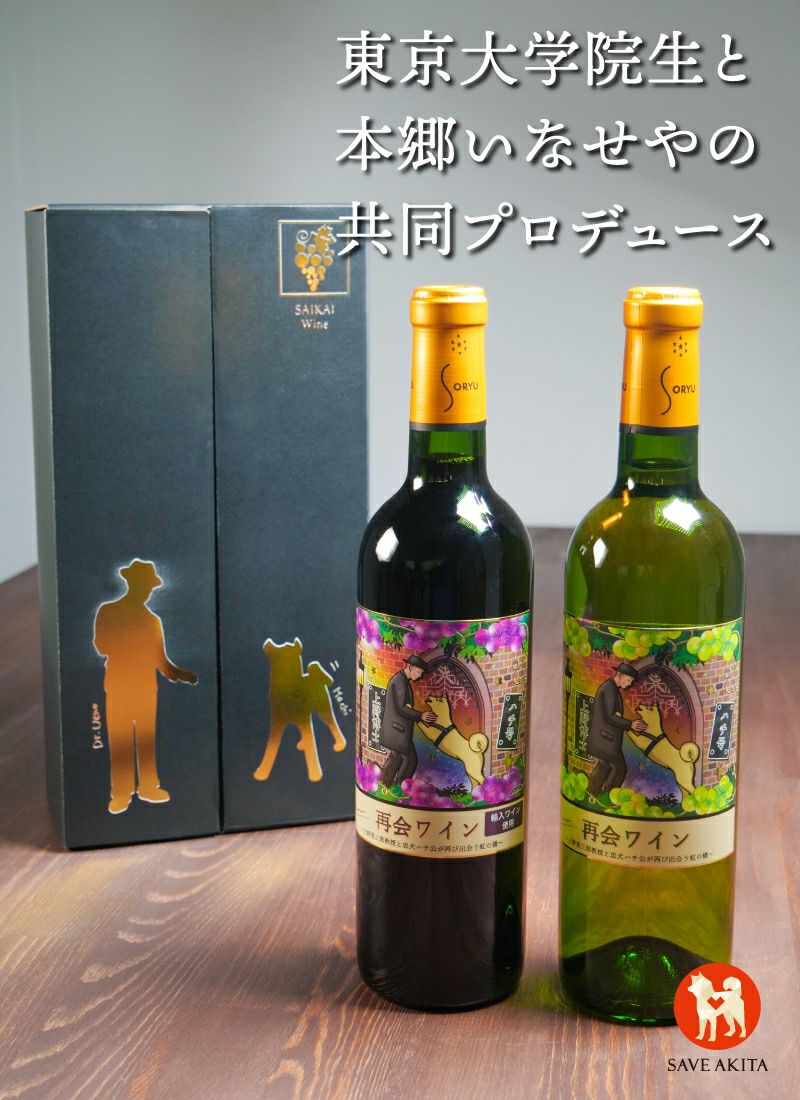ハチと上野博士が再会し、ともに寄り添いながら天国へ続く虹の橋を渡ってほしいという願いを込めて「再会ワイン」と名付けられた商品には、赤と白の2種類があります。